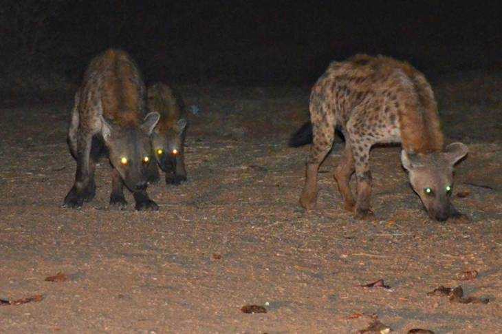 Туристы и нетуристы стоят у своих машин или мотоциклов с каретами, которые называются тут бодяджи. Машин бывает пять-шесть. Это не много. Они все стоят плотно рядом и включают фары. Но саванна такая тёмная, что фотографии всё равно делать сложно. Никто не разбредается. После того как кормилец с корзиной получил доверие вожака, он начинает созывать животных по именам. Очень смешно смотреть на зверей с пятнистой клочьями шерстью, с приземистым задом, круглыми ушами и горящими зелёными глазами. А глаза-то у них горят ярким зелёным пламенем. Они светятся повсюду. К своему ужасу, мы обнаружили, что звери повсюду вокруг нас. Мы оказались в кругу. Они выходили из кустов, большие и маленькие, собирали неспешно разбросанное мясо и уходили на всякий случай. Оценив обстановку, снова появлялись и собирали куски потрохов. Между собой не спорили и не дрались. Еды всем хватало, ещё и оставалось, а по утрам куски от ночного шоу подбирали птицы-падальщики. Их здесь тоже хватает. Саванна ведь!