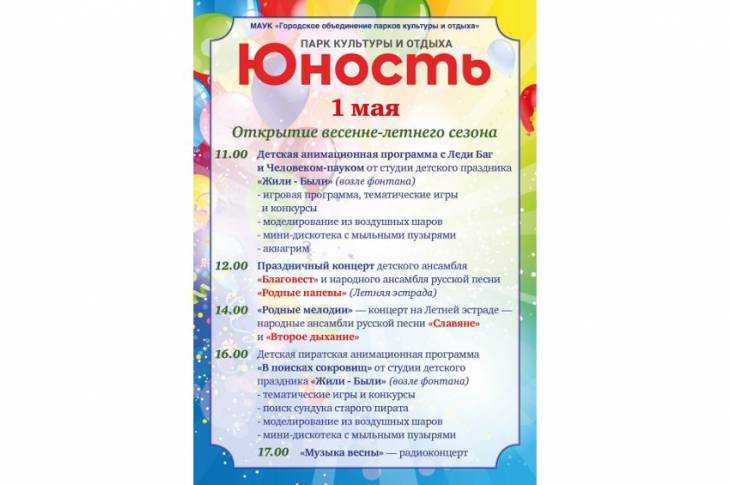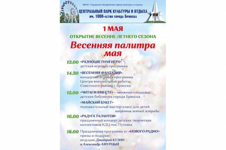 1 мая заработают городские парки Брянска. По этому случаю подготовлены концерты, спортивные соревнования для детей и родителей, конкурсы, игры, викторины и многое другое.