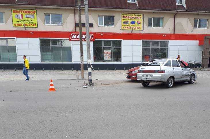 В Брянске на улице Фрунзе столкнулись легковушки. Судя по опубликованным в соцсети фото, одна из них задела столб.