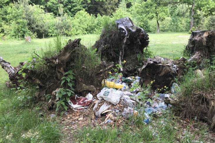 На живописном берегу реки Снежки неряшливые граждане использовали два огромных пня. Если посмотреть с одной стороны, то ничего странного не замечается, но если подойти к пням со стороны реки, то все становится ясным. Пространство между ними заполнили отходами любители шашлыков: бутылки, стекло, пакеты и так далее. Причем такие же свалки в естественных укрытиях разбросаны и в других местах на берегу реки.