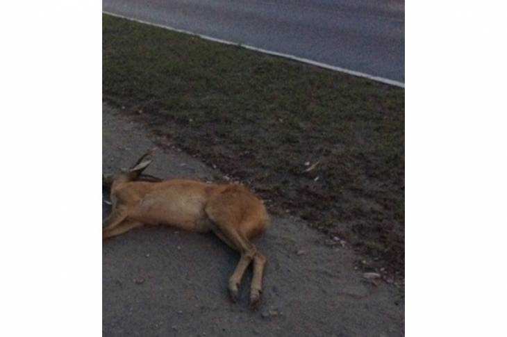 Фото с места ДТП очевидцы опубликовали в соцсети. По всей видимости, животное выбежало из кустов на дорогу в панике от того, что оказалось среди машин и строений. В сумерках включенный ближний свет автомобилей тоже мог напугать косулю.