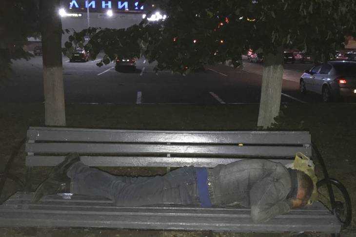 К вечеру они занимают свободные скамейки и с комфортом укладываются на них. Те, кому места над землей не досталось, устраивают себе лежбище прямо на асфальте. Покупатели осторожно переступают бойцов бродяжьего фронта, боясь потревожить их сон. Неудобства бомжи испытывают лишь во время дождя.