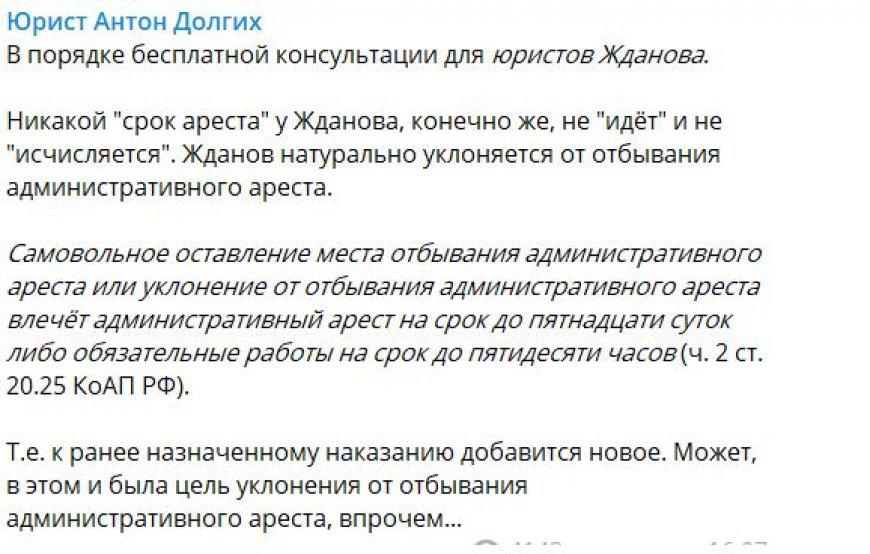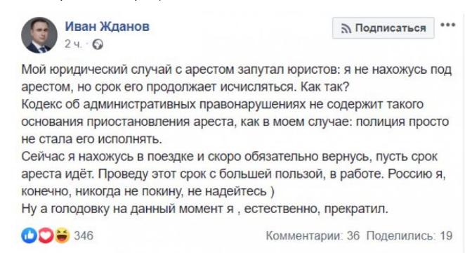 Однако Жданову удалось воспользоваться своей свободой, предоставленной на несколько часов, и сбежать из России. Об этом он рассказал в соцсетях, где, так же, заявил о прекращении голодовки. Как признался Жданов, он уехал их страны, чтобы переждать 10 суток наказания. Но российское законодательство не предусматривает таких вариантов – ответственность не исчезнет.