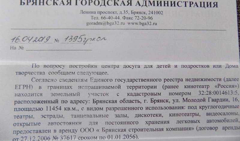 Горожане предложили построить здесь здание для детей, но оказалось, что «все уже… поделено до нас». Землю до 2056 года получила в распоряжение «Брянская строительная компания». Строить на ней можно все – танцевальные залы, видеосалоны, даже автомобильные стоянки, однако о детях никто не помышляет. «Бывшим властям города дети, видимо, были большой помехой», – пожаловались жители Бежицкого района.
