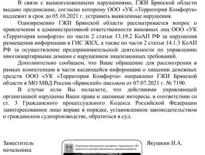 Помимо нарушения сроков рассмотрения обращений собственников по средствам системы ГИС ЖКХ, ГЖИ Брянской области уже предъявила «Территории комфорта» претензии за нарушение порядка размещения обязательной информации, что имеет признаки состава административного правонарушения, предусмотренного ч. 2 ст. 13.19.2. КоАП РФ. В ряде нарушений надзорное ведомство усматривает состав по части 2 статьи 14.1.3 КоАП РФ − речь идет о предпринимательской деятельности по управлению многоквартирными домами с нарушением лицензионных требований.