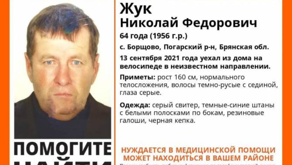 В Погарском районе Брянской области пропал без вести 64-летний Николай Жук, об этом сообщили в поисковом отряде «Лиза Алерт».
