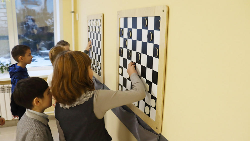 В школе установили также интерактивные доски, настенные шахматы, шашки и домино. У младших классов теперь свой спортзал.