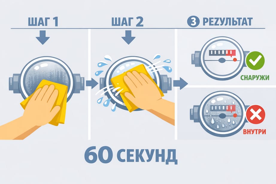 Правильная диагностика за 60 секунд сэкономит время, нервы и деньги. Метод «сухой салфетки» — это первое, что делают профессиональные сантехники при вызове. Подготовьте сухую бумажную салфетку или безворсовую ткань. Тщательно протрите стекло счетчика и посмотрите на стекло под углом. Подождите 2-3 минуты и проверьте снова, после чего сделайте вывод.