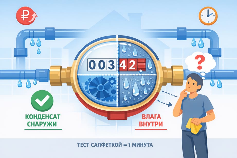 Если капли стираются и появляются снова на поверхности — поздравляем, это не поломка. Это физический процесс под названием «точка росы». Объясню просто: холодная труба с водой + теплый влажный воздух ванной = конденсат на всех холодных поверхностях, включая стекло счетчика. Основные причины внешнего запотевания: плохая вентиляция в ванной, протекающий бачок унитаза, отсутствие теплоизоляции труб, сезонный фактор.