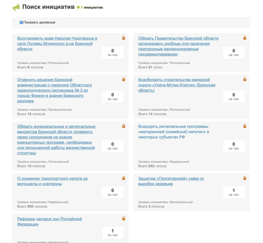 Поиск по архиву инициатив выдает 9 предложений, которые относились к Брянской области. Так, граждане просили восстановить храм Николая Чудотворца в селе Луговец Мглинского района, обязать ведомства проверять своих сотрудников на знание компьютерных программ, необходимых для полноценной работы. Были инициативы по отмене решения администрации о переносе наркологического диспансера в здание Бежицкого роддома, защите «Пролетарского сквера» от вырубки деревьев. Примечательно, что все эти инициативы не набрали нужного количества голосов и не были рассмотрены.