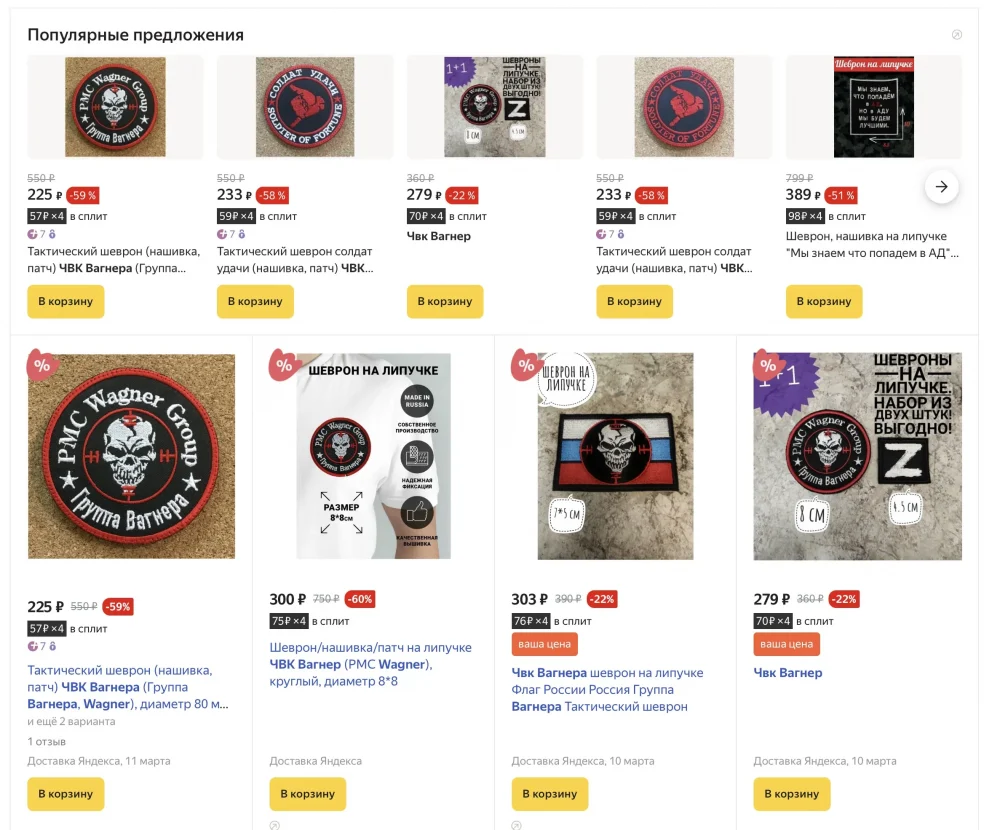 «Яндекс.Маркет» тоже не отстает: в изобилии шевроны и флаги «ЧВК Вагнер».