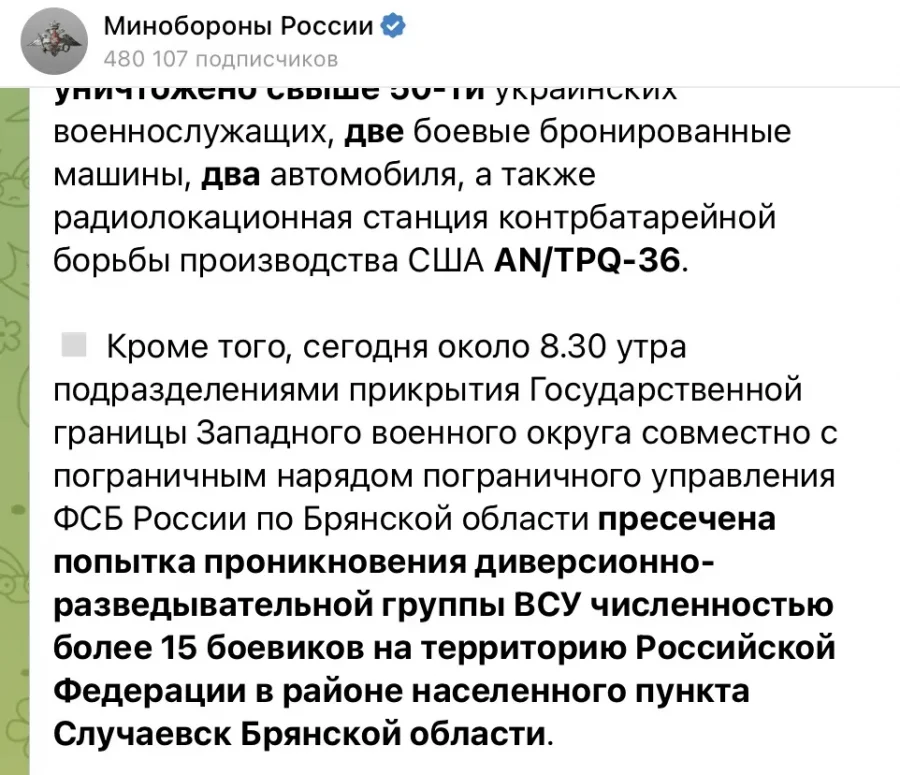 Примечательно, что Минобороны ошиблось с названием брянского села, заявив, что «пресечена попытка проникновения диверсионно-разведывательной группы ВСУ численностью более 15 боевиков на территорию Российской Федерации в районе населенного пункта Случаевск Брянской области».