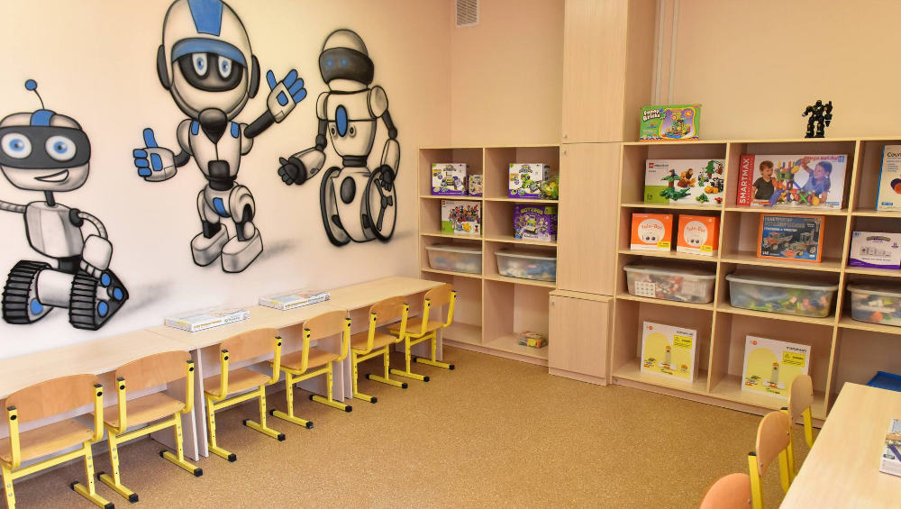 В нем расположены просторные групповые комнаты, спальни, пищеблок, спортивный и музыкальный залы, музей, кабинет для занятий робототехникой, медблок с современным оборудованием, кабинет логопеда.