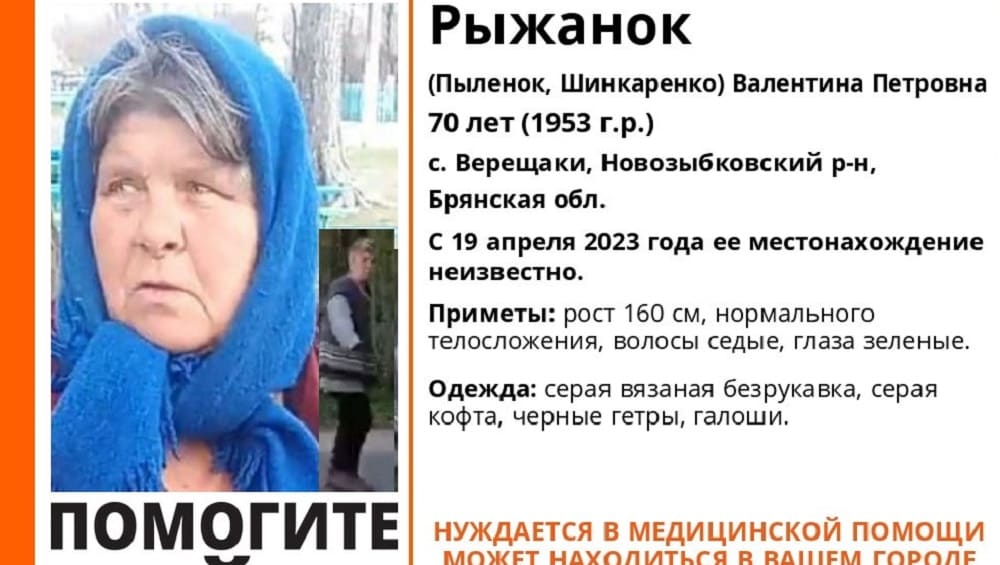 В Новозыбковском округе Брянской области пропала без вести 70-летняя жительница села Верещаки Валентина Рыжанок (Пыленок, Шинкаренко), об этом сообщили в поисковом отряде «Лиза Алерт».