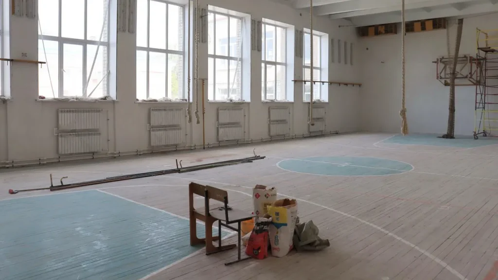 Сейчас на третьем этаже в коридорах, рекреациях и фойе полностью уложен керамогранит. В кабинетах сделаны новые заливные полы, на которые впоследствии уложат линолеум. Также полностью меняется система отопления, электропроводка. В школе отремонтируют санузлы, большой и малый спортивный залы — там уложат новое спортивное покрытие, установят защитные сетки на окна. Также ремонт затронет и библиотеку.