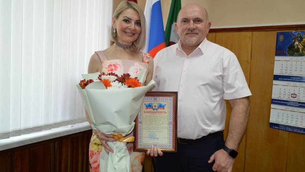 Глава администрации Дятьковского района Павел Валяев по поручению администрации луганского города Брянки вручил певице Сергии Шамбер Благодарственное письмо за подписью главы администрации Брянки Евгения Морозова.