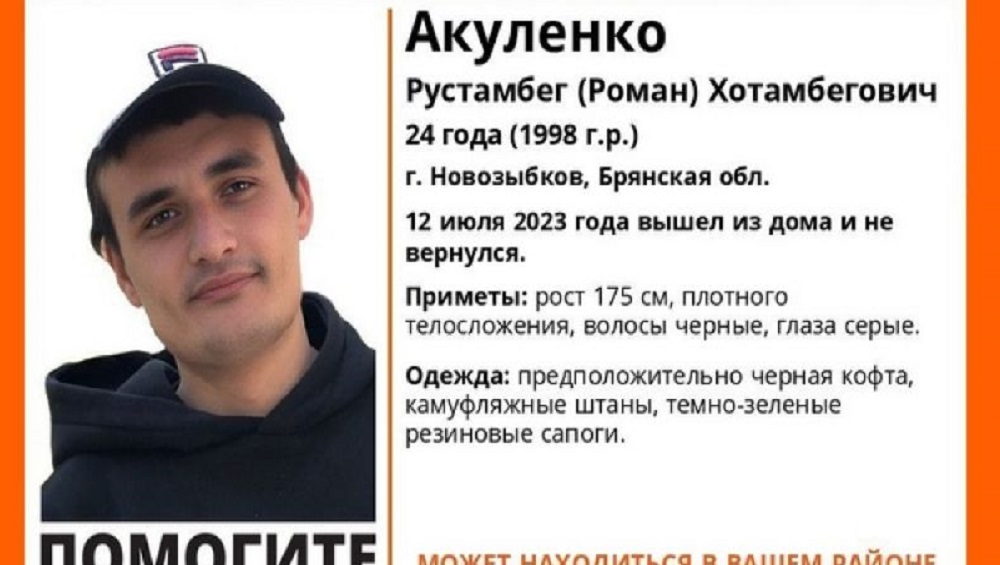 В Новозыбкове Брянской области 12 июля пропал без вести 24-летний Рустамбег Акуленко