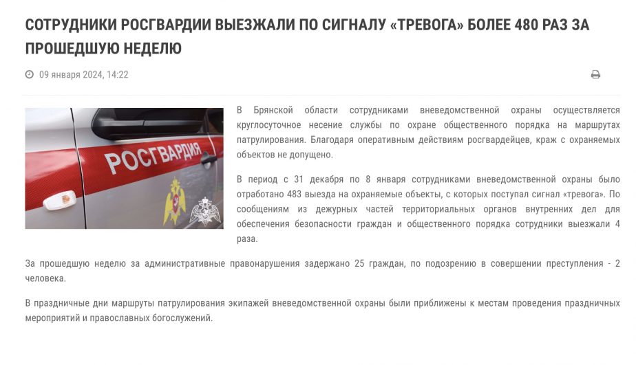 Брянское управление Росгвардии затихло на месяц. Очевидно, пока шел разбор полетов, как оружие оказалось в руках ребенка, как проверялось частное охранное предприятие, которому была доверена охрана гимназии, ведомству было не до отчетов. После проверки управление возобновило бессмысленные доклады о количестве выездов.