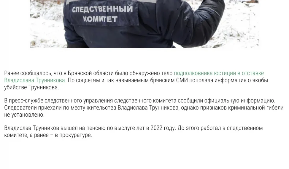 Следственное управление СК России по Брянской области через ряд местных изданий поспешило обвинить «Брянские новости», совершенно забыв про своего бывшего сотрудника. Речь идет о ситуации с делом Владислава Трунникова, труп которого накануне был обнаружен с огнестрельным ранением.
