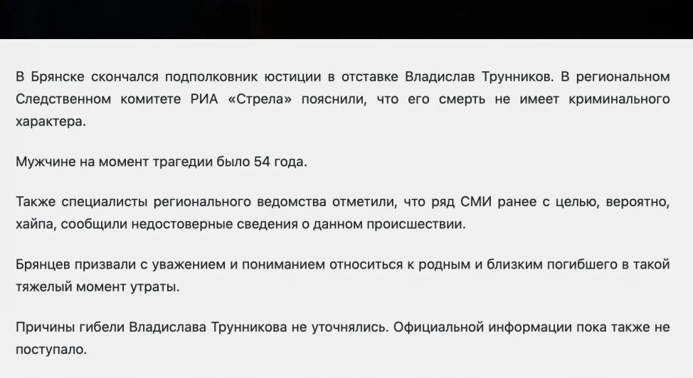Примечательно, что и процитировавшие якобы официальное сообщение СУ СК России по Брянской области, которое нигде не опубликовано, брянские издания в итоге сообщили, что «причины гибели Владислава Трунникова не уточнялись. Официальной информации пока также не поступало». Причем одни сайты, ссылающиеся на управление СК, сообщили о «трагической гибели», другие просто написали, что Трунников скончался. Странное противоречие.