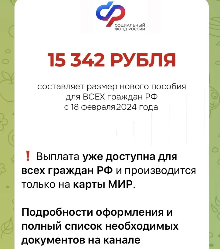 «Выплата уже доступна для всех граждан РФ и производится только на карты МИР», — гласило объявление.