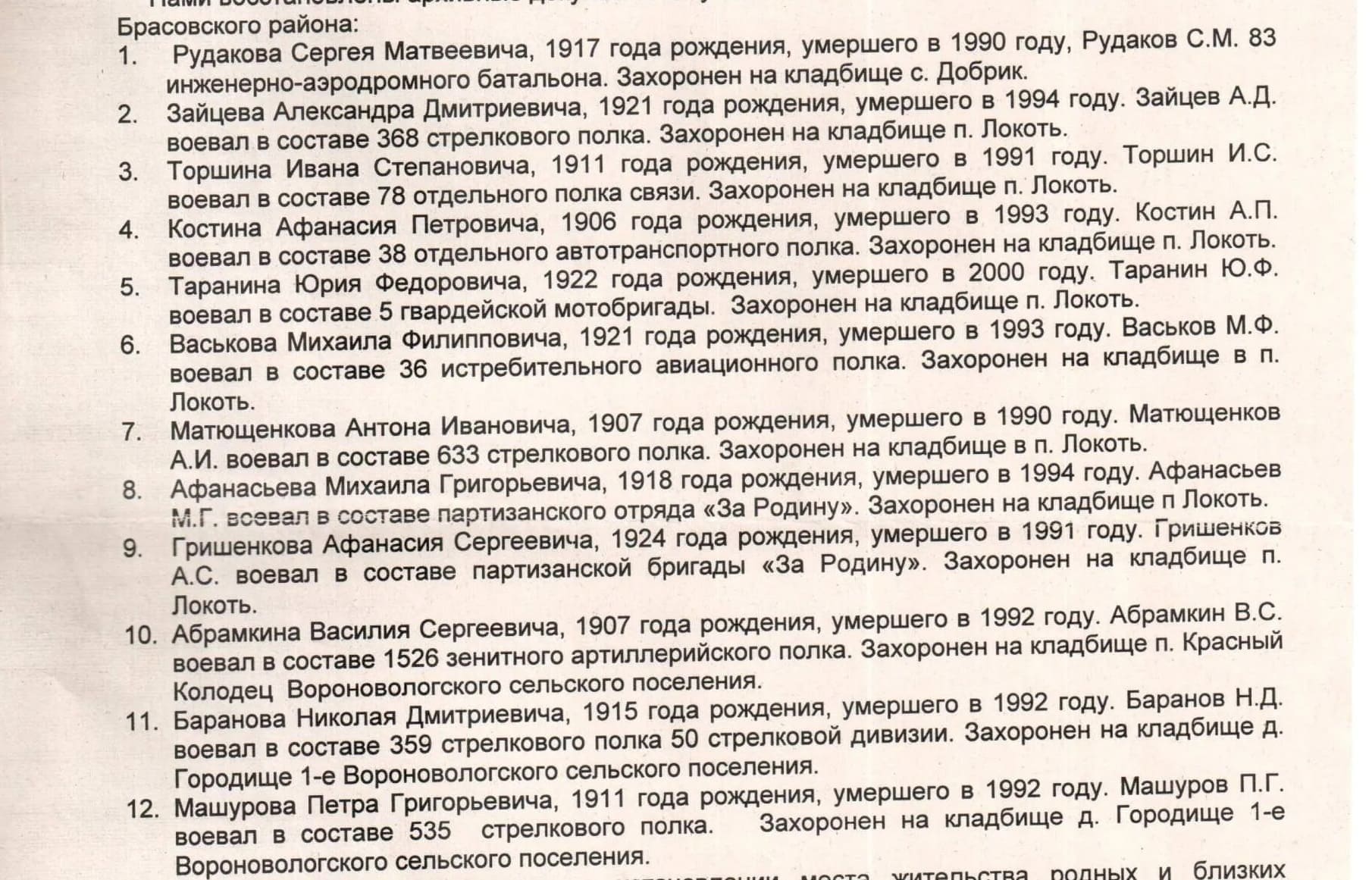 Таким образом, разыскиваются родственники участников Великой Отечественной из Брасовского района Сергея Рудакова, Александра Зайцева, Ивана Торшина, Афанасия Костина, Юрия Таранина, Михаила Васькова, Антона Матющенкова, Михаила Афанасьева, Афанасия Гришенкова, Василия Абрамкина, Николая Баранова, Петра Машурова.