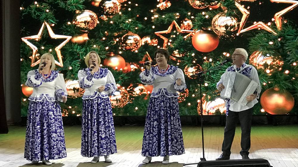 Ансамбль «Маски» исполнил новогоднюю детскую песню и напомнил советские мелодии, что вызвало благодарную реакцию зала.