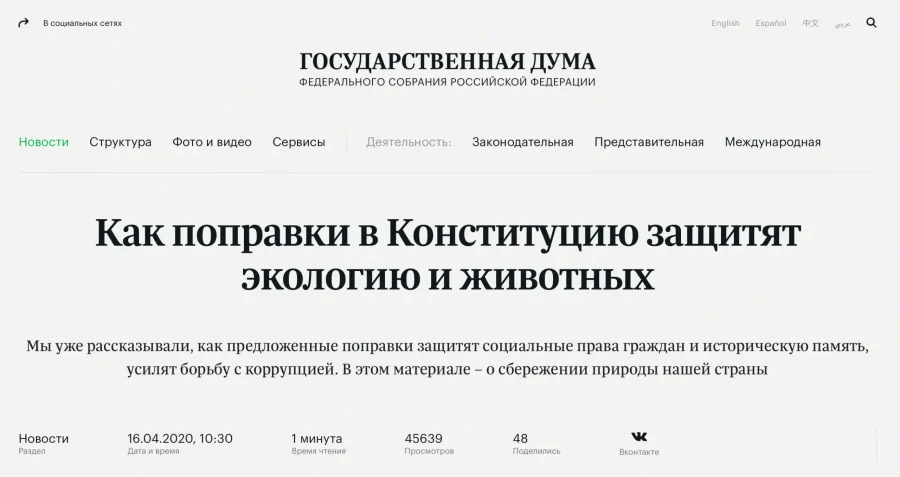 Еще есть вопросы к тем, кто пять лет назад выступал с трибун, когда обновляли Конституцию страны. Тогда заявлялось, что «поправки в Конституцию защитят экологию и животных».