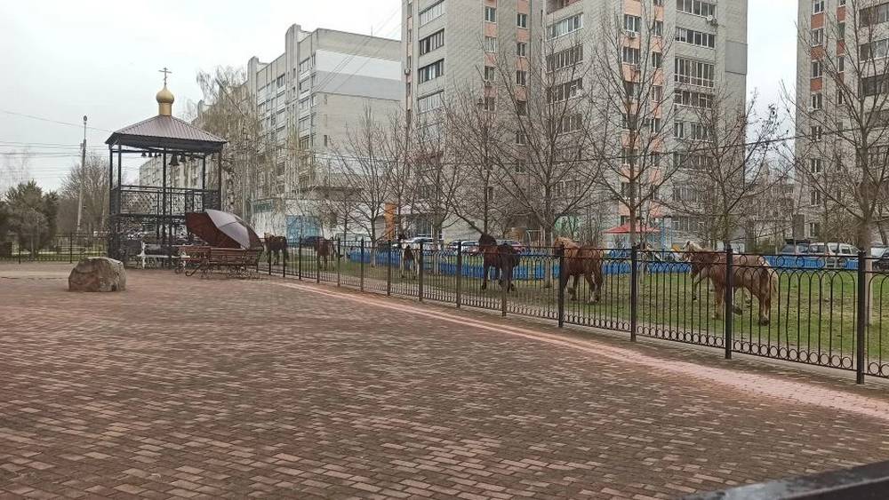 На газон в Брянске на Новостройке возле храма вышли девять цыганских лошадей. Это рекордное стадо.