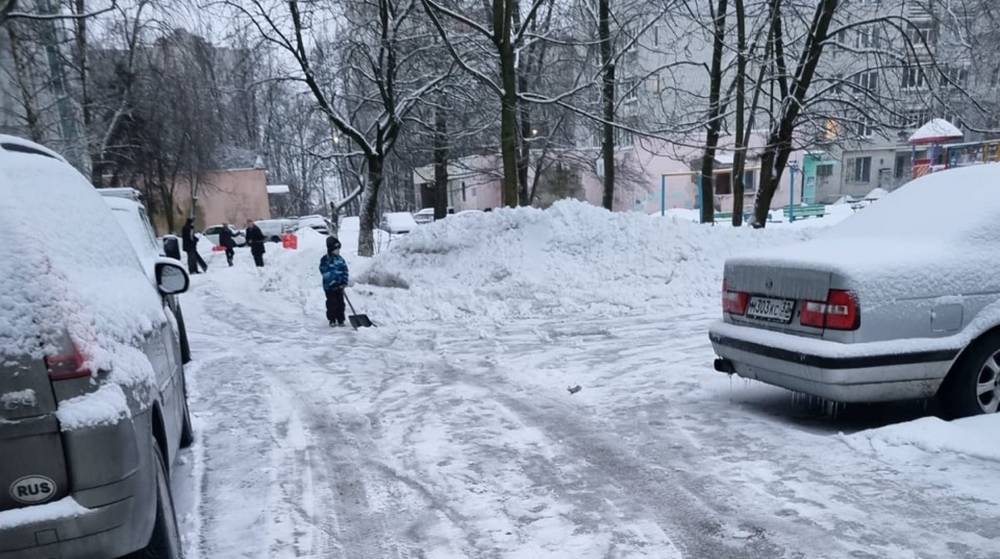 В Брянске на уборку снега вышел дворник с семьей, в том числе детьми. Уборка началась в 6 утра, и мальчишки наравне с родителями очищали территорию