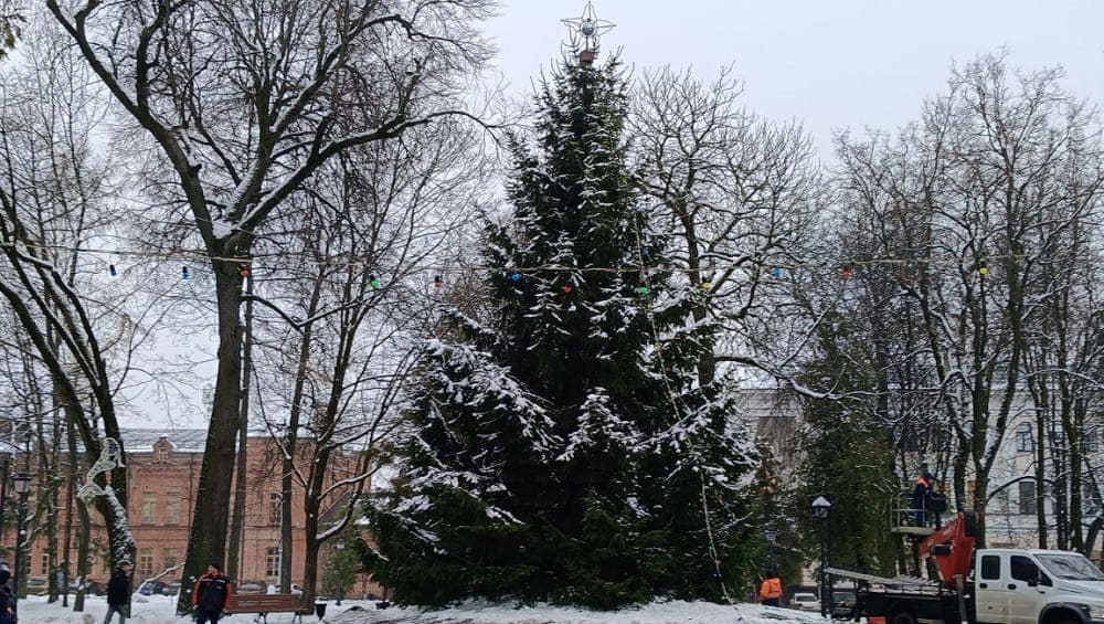 В Круглом сквере Брянска главную городскую ёлку украсили гирляндами и пятиконечной звездой, также к праздничному дереву подключили иллюминацию